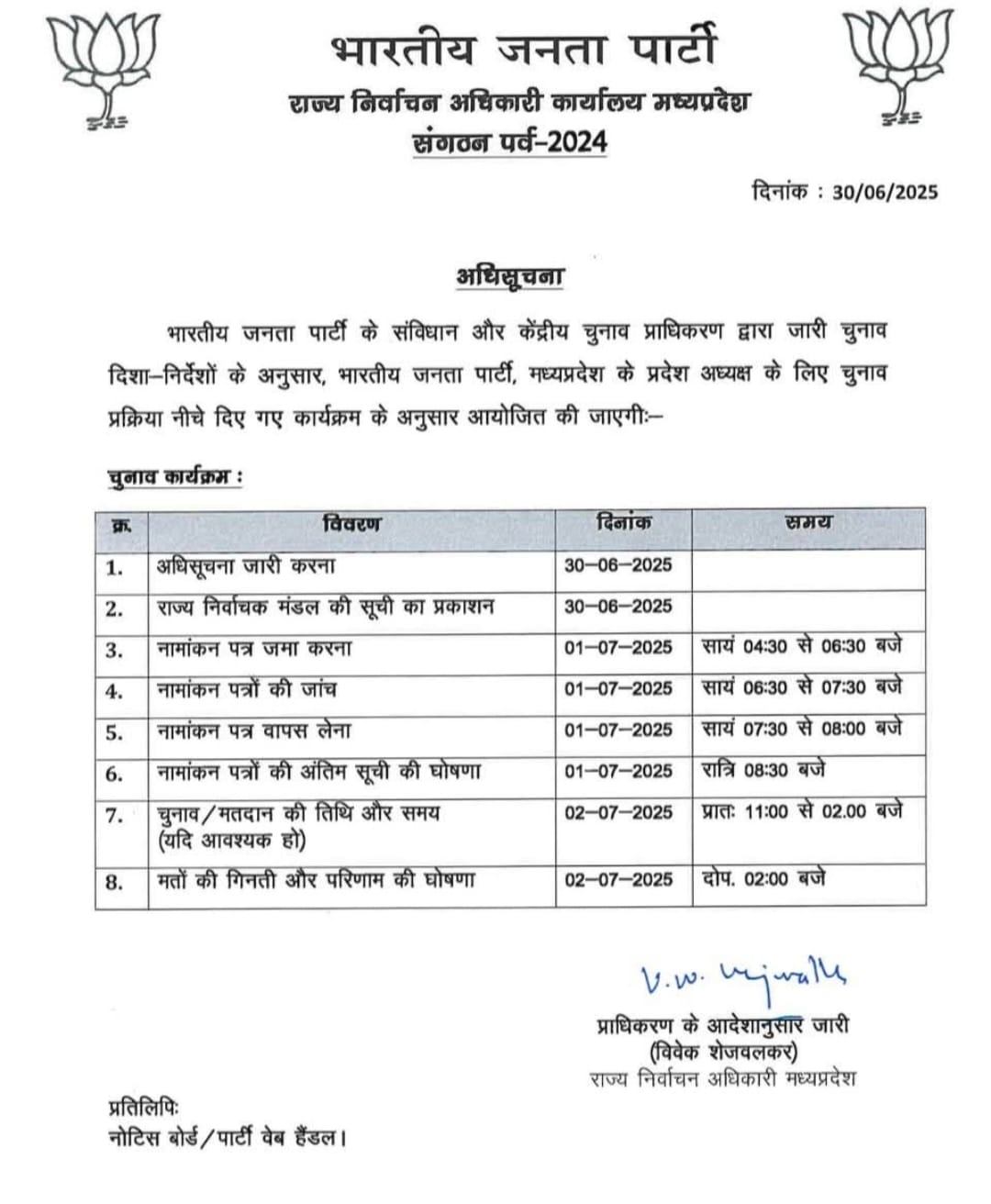 भारतीय जनता पार्टी (BJP) के संविधान और केंद्रीय चुनाव प्राधिकरण द्वारा जारी चुनाव दिशा-निर्देशों के अनुरूप, मध्य प्रदेश में प्रदेश अध्यक्ष के चुनाव की प्रक्रिया औपचारिक रूप से आरंभ हो गई है। पार्टी के संगठन में इस महत्वपूर्ण पद के लिए चुनाव पत्र में निर्दिष्ट कार्यक्रम के अनुसार विभिन्न चरणों में चुनाव कार्यवाही आयोजित की जाएगी।