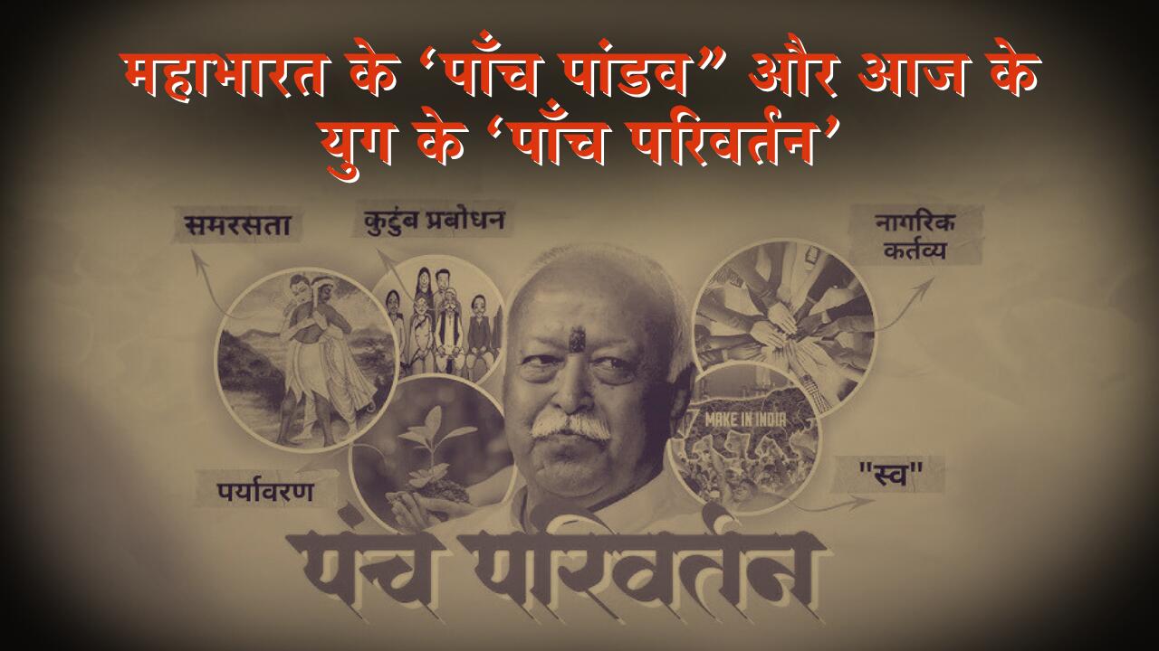 संघ अपने शताब्दी वर्ष में प्रवेश कर चुका है। पूरे भारतवर्ष में संघ के शताब्दी वर्ष के कार्यक्रम हो रहे हैं । इन सौ वर्षो में संघ ने बिना किसी दिखावे के सतत चलते हुए समाज में भारत के लोगो के मन में अपना एक स्थान बनाया। अनेक उतार चढ़ाव भरी सौ वर्ष कि यात्रा करने के बाद संघ ने अपने समाज को मजबूत और स्वावलंबी बनाने के उद्देश्य से ऐसे पंच मंत्र दिए हैं जिनके अनुसार भारत के लोग सही ढंग से आचरण करें तो भारत में बहुत बड़ा सकारात्मक परिवर्तन हो सकता है। ये पांच मंत्र वास्तव में महाभारतकालीन पांच पांडवों जैसे हैं, जो आज के युग के महाभारत में धर्म को विजयी बनाने में सहायक होंगे । जिस प्रकार से महाभारत के पांच पांडवों के अपने अपने व्यक्तित्व के गुण थे ठीक उसी प्रकार से आज के समय में इन पांच मंत्रों या पंच परिवर्तनों के भी अपने गुण हैं, जो समाज में समावेशी हो कर समाज की दशा और दिशा बदल सकते हैं । इन पंच परिवर्तन के पाँच बिंदु हैं- सामाजिक समरसता, कुटुम्ब प्रबोधन, पर्यावरण संरक्षण, स्व का बोध और नागरिक कर्तव्य और शिष्टाचार।