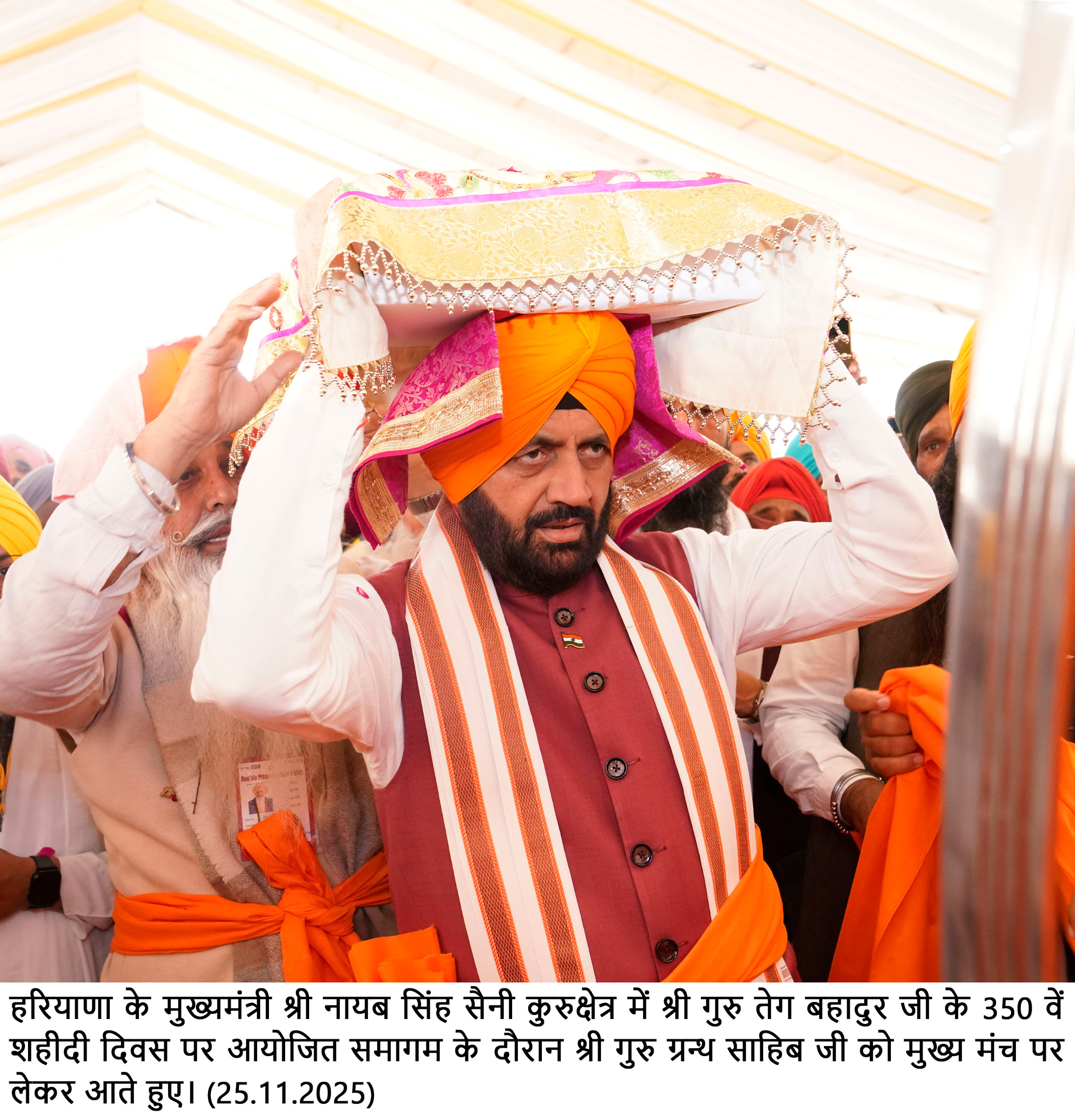 कुरुक्षेत्र की पवित्र भूमि मंगलवार को एक अद्वितीय आध्यात्मिक भाव से भर उठी, जब श्री गुरु तेग बहादुर जी के 350वें शहीदी दिवस पर राज्य स्तरीय समारोह में हरियाणा के मुख्यमंत्री श्री नायब सिंह सैनी ने स्वयं श्री गुरु ग्रंथ साहिब जी को सिर पर धारण कर मुख्य मंच तक ले जाने की पवित्र पालकी सेवा निभाई।संगत के बीच यह क्षण एक ऐतिहासिक दृश्य की तरह दर्ज हो गया। अत्यंत सम्मान, विनम्रता और गहन श्रद्धा से निभाई जाने वाली इस सेवा को ख़ुद मुख्यमंत्री नायब सैनी ने जिस तरह निभाया, वो सिख परंपरा और गुरुओं के प्रति उनकी और प्रदेश की निष्ठा का अद्भुत प्रतीक बन गई।